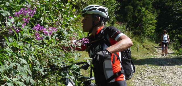 Et bah juste quand ensuite ça devient facile - c'est arrivé au bon moment - pffiouuu!. Jacky et moi sommes allés lui cueillir des framboises roses et des framboises jaunes comme deux frères consolant leur petite sœur, et un beau brin d'épilobe aussi. Et pour Julie aussi parce qu'à GrésyFreeRide on bichonne nos GrésyFreeRideuses.